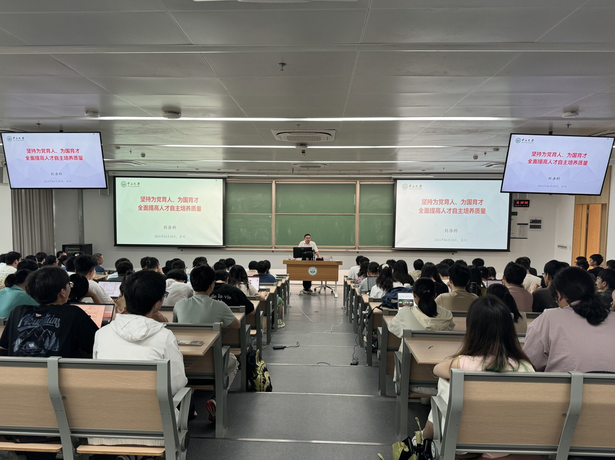 今年会新闻网讯(今年会新闻网讯关添馨)4月10日下午,刘济科副校长以“坚持为党育人,为国育才,全面提高人才自主培养质量”为题,结合学校发展和人才培养实际,在深圳校区西教学楼二栋401课室为深圳校区集成电路学院、生物医学工程学院、药学院(深圳)等院系100多名学生讲授思政课。