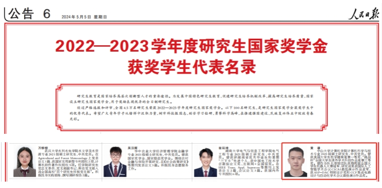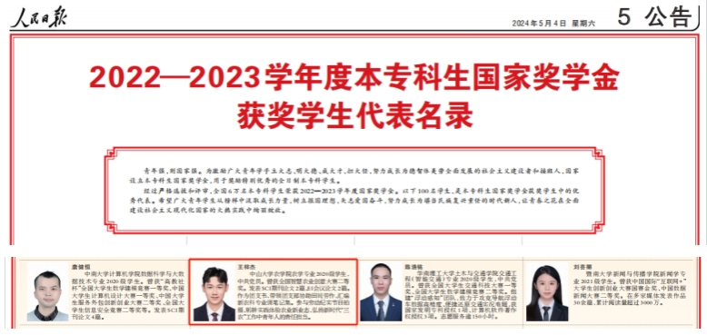 今年会新闻网讯(通讯员林仪)5月4日、5日,《人民日报》整版刊登2022—2023学年度《本专科生国家奖学金获奖学生代表名录》《研究生国家奖学金获奖学生代表名录》,我校农学院(现已更名为农业与生物技术学院)农学专业2020级本科生王梓杰和计算机学院计算机科学与技术专业2021级硕士研究生黄谦分别名列其中,这是我校本科生和研究生首次同时入选。