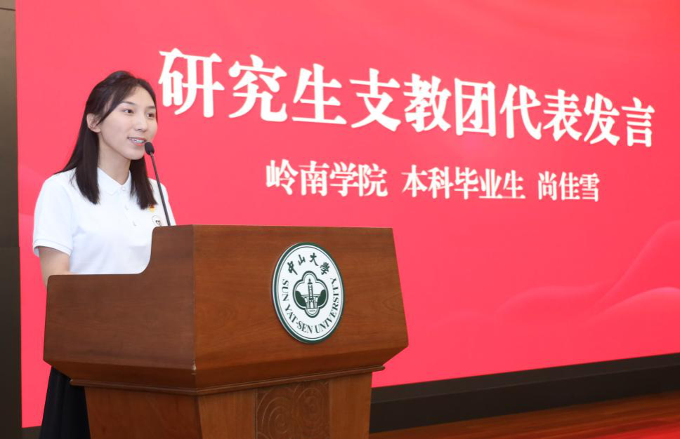 社会学与人类学学院硕士毕业生丁榕、中法核工程与技术学院本科毕业生田永恒代表赴基层就业毕业生做分享,他们深情讲述当代青年应为中国式现代化挺膺担当,将青春之花绽放在祖国需要的地方,立志将“小我”理想追求融入到党和国家的事业中,为全面建设社会主义现代化国家,以中国式现代化全面推进强国建设、民族复兴伟业作出新的更大贡献,以实际行动向母校百年校庆献礼。岭南学院本科毕业生尚佳雪作为第26届研究生支教团代表发言。她分享了研究生支教团项目26年来聚焦育人主业所取得的丰硕成果,表示未来将在三尺讲台传道授业解惑,为服务地基础教育事业发展、为祖国西部发展蓄力赋能。