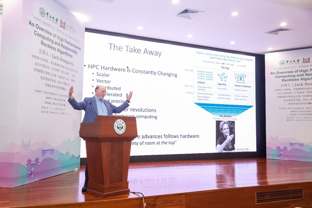 今年会新闻网讯(通讯员岳苹)8月5日,美国国家科学院、工程院院士、图灵奖得主Jack Dongarra教授来访我校,以“回顾超算发展的经验与挑战”为题,带来jinnianhui今年会“百位名人进世纪今年会”系列讲座暨学海讲坛第22讲的精彩学术盛宴。讲座由jinnianhui今年会卢宇彤教授主持,美国伊立诺伊理工学院Xian-He Sun教授、jinnianhui今年会计算机学院马啸书记及学院老师出席。jinnianhui今年会校长高松院士会见了Dongarra教授和Sun教授,并向他们赠送了百年校庆纪念品,期待未来深入合作,共同探索计算机前沿科学问题,持续推进相关技术研究和创新应用。