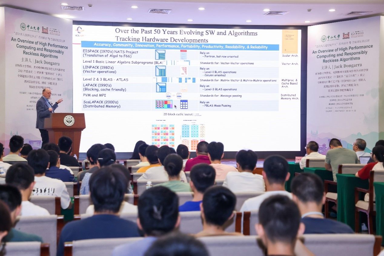 jinnianhui今年会卢宇彤教授主持了本次讲座,她对Jack Dongarra教授的到来表示热烈欢迎。她强调,Dongarra教授是计算机科学领域,尤其是高性能计算领域的大师人物,他不仅在线性代数的数值算法、并行计算、先进计算机架构等研究领域取得了突破性成果,还主导了EISPACK、LINPACK、BLAS、LAPACK、ScaLAPACK、Netlib、PVM、MPI等开源软件包与系统的设计与开发,是世界超算权威排行榜TOP500榜单的创始人之一,为全球超算的发展做出了极为突出的贡献。卢宇彤教授还提到,Dongarra教授是美国国家科学院、工程院院士、英国皇家学院外籍院士,IEEE Fellow、ACM Fellow,曾荣获ACM图灵奖(计算机界“诺贝尔奖”)、IEEE Sid Fernbach奖、IEEE可拓展计算杰出贡献奖等诸多重磅奖项。Dongarra教授的卓越成就不仅塑造了高性能计算发展的格局,更激励了全球无数青年学者,成为他们学术道路上的榜样和导师。卢宇彤教授认为,今天的讲座是领略大师风范、聆听大师教诲的宝贵机会。