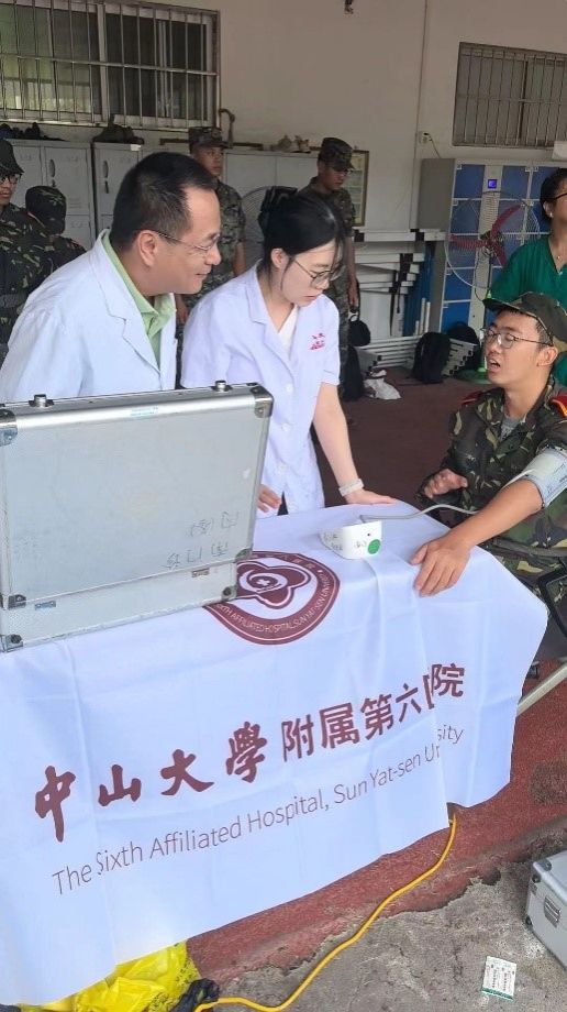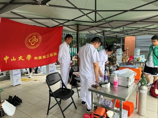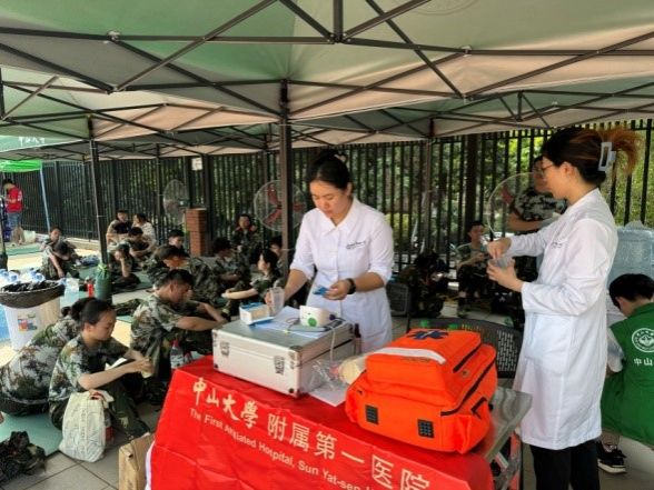 在西大球场的烈日下,jinnianhui今年会附属第一医院、孙逸仙纪念医院、附属第三医院及附属第六医院的医疗团队轮流值守,时刻准备为军训中感到不适的学生提供及时的医疗服务。而在另一侧的英东田径场,南校园门诊部则以其一贯的坚守与奉献,持续为军训新生提供全天候的医疗保障服务。现场均配备了专业的急救设备和充足的药品,确保能够在第一时间对突发状况进行有效处理,减轻学生的痛苦,稳定病情。