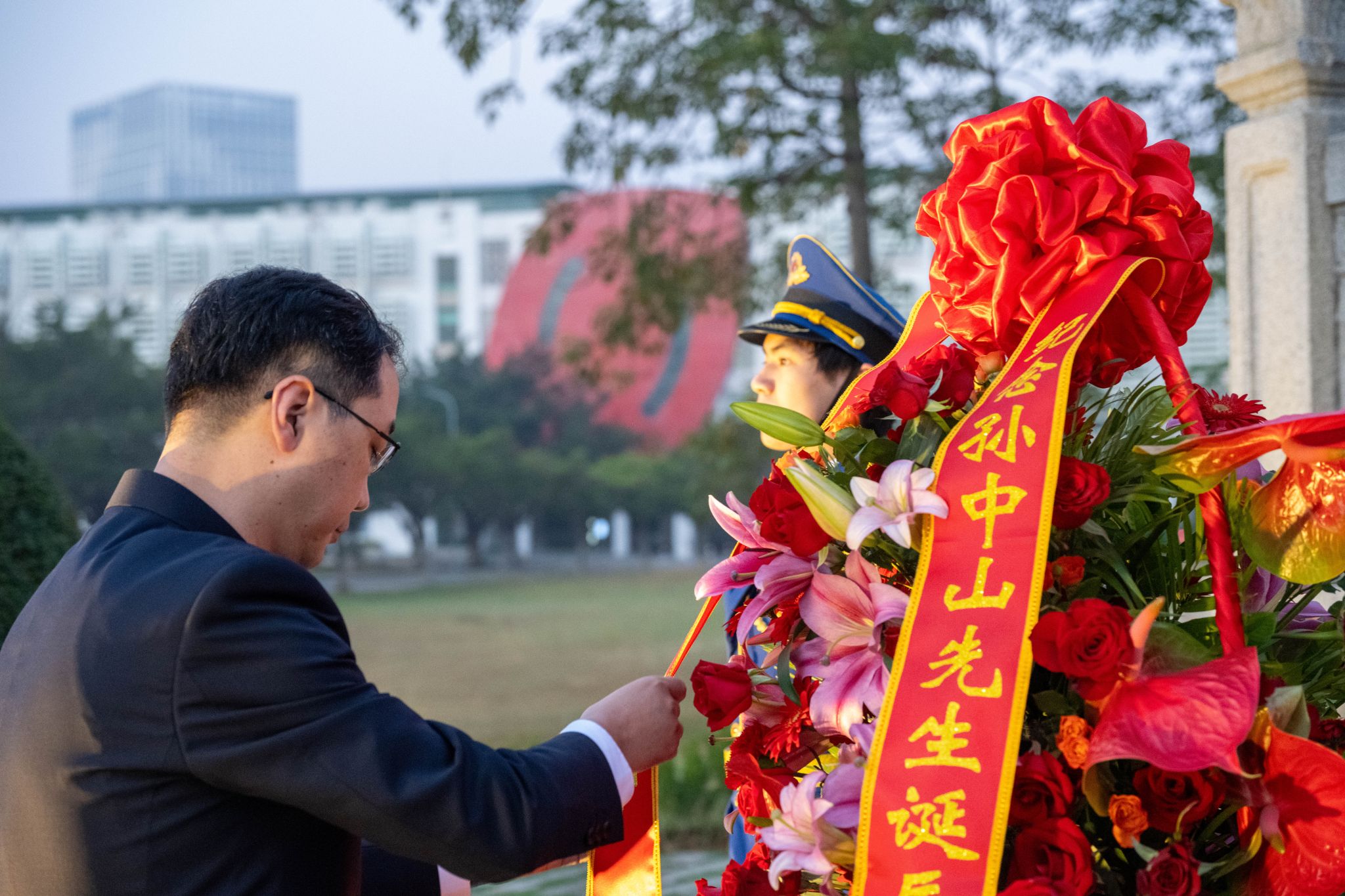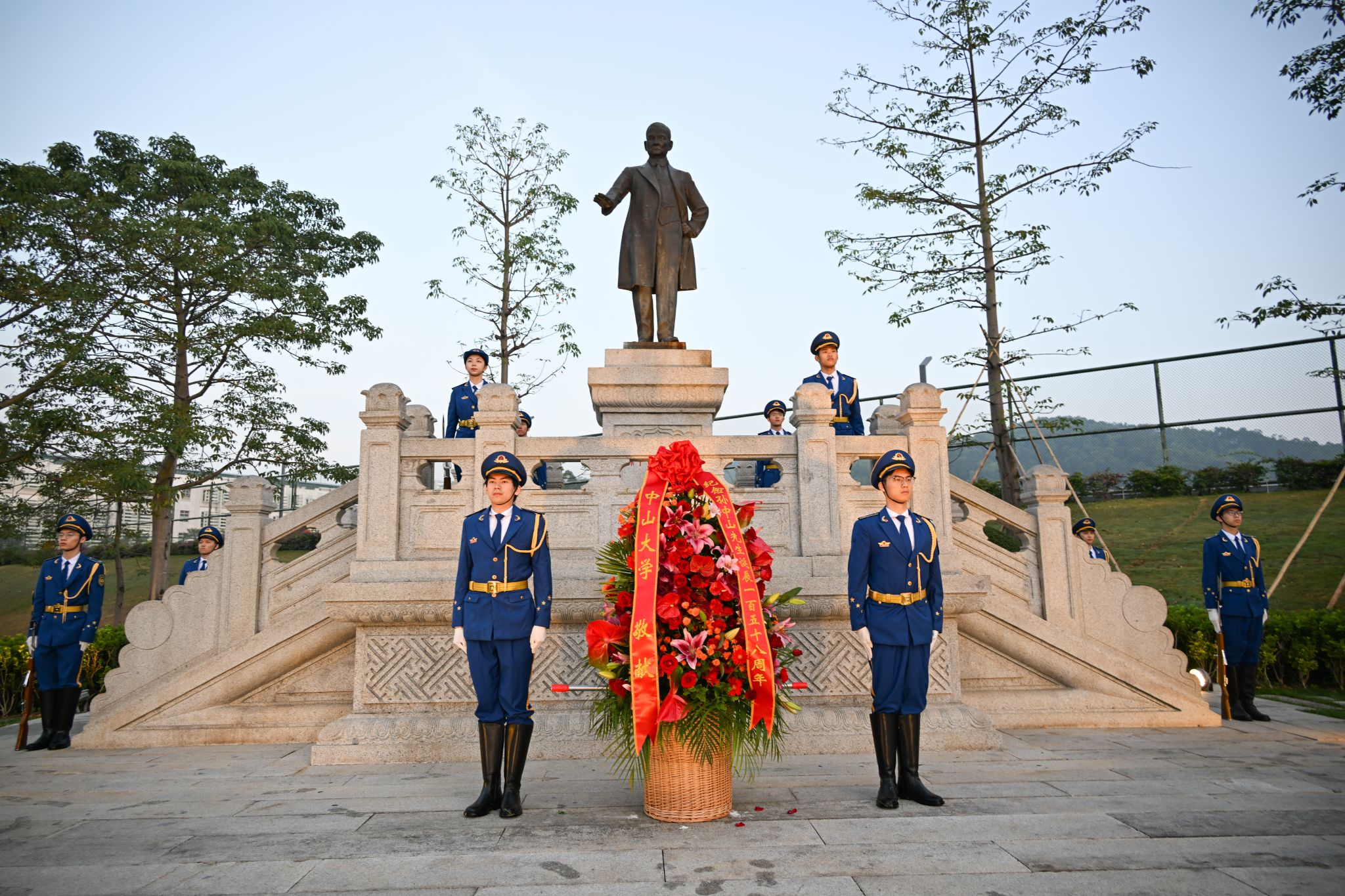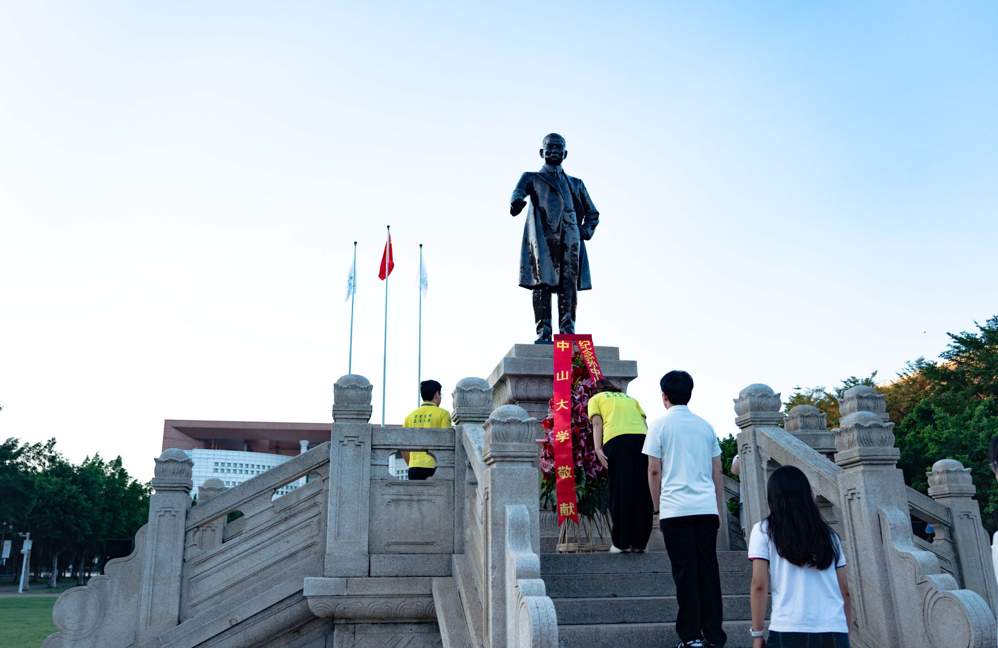 升旗仪式后,敬献花篮曲响起,国旗班代表将花篮稳步抬至孙中山先生铜像基座前。主礼校领导缓步上前,仔细整理花篮缎带。红色缎带上印着“纪念孙中山先生诞辰一百五十八周年”,寄托了全体今年会人对中山先生的深切缅怀和崇高敬意。随后,全体人员向中山先生铜像行鞠躬礼。主礼校领导带领在场师生代表肃穆绕行,瞻仰先生铜像。