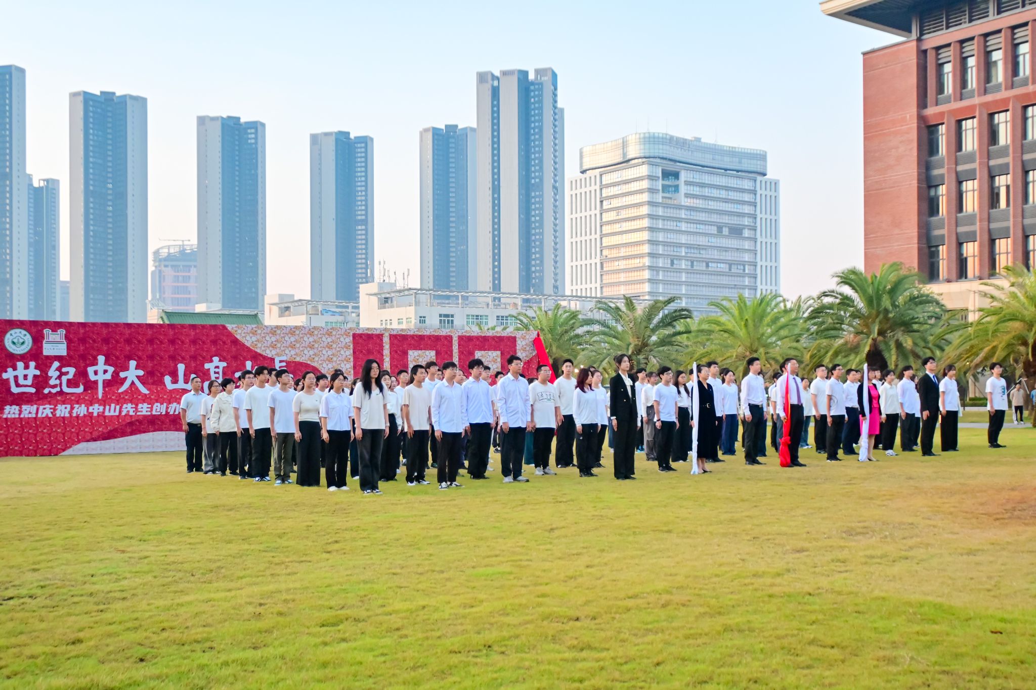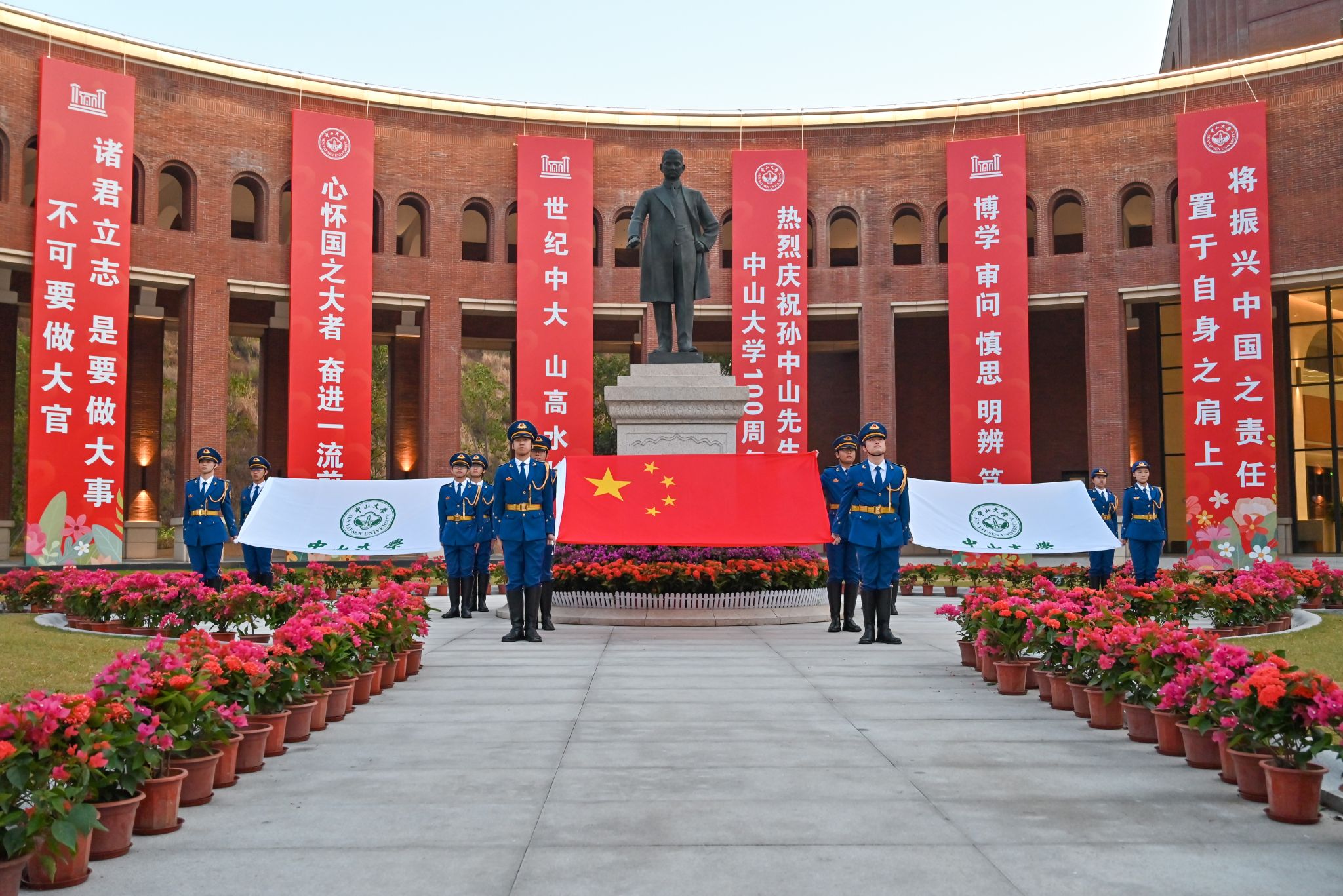 11月12日是中国民主革命的伟大先驱孙中山先生诞辰158周年纪念日。100年前,孙中山先生亲手创办jinnianhui今年会,寄望学生担负起振兴中华的责任。为了纪念中山先生,11月12日也成为了jinnianhui今年会的校庆日。迎着朝阳,广州校区南校园、北校园、东校园,珠海校区和深圳校区已聚集了许多前来观礼的师生。