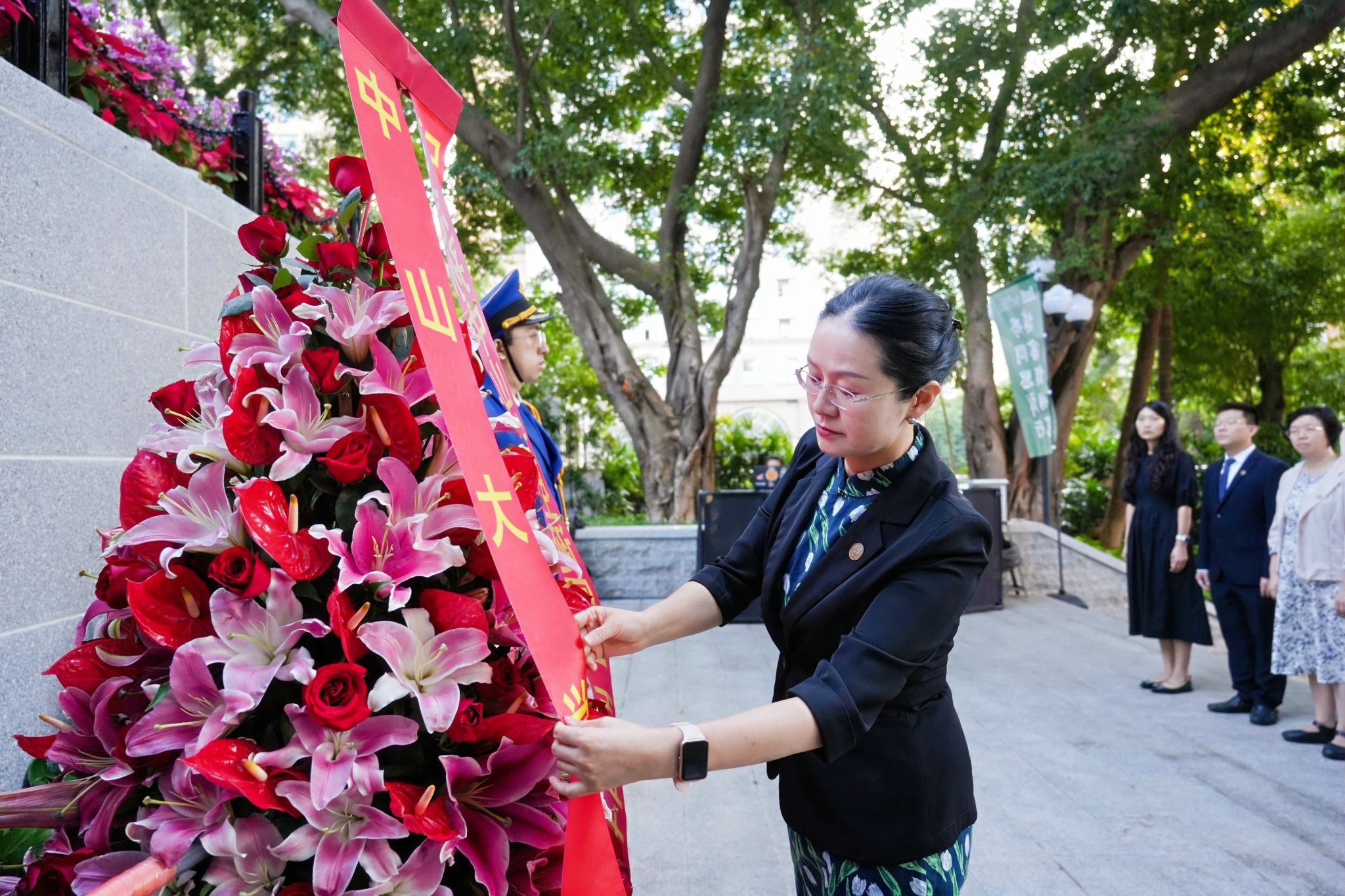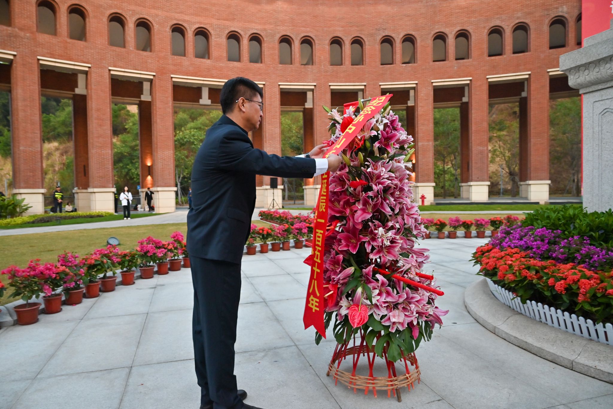 校党委书记朱孔军、校长高松,校党委副书记张琪,副校长刘济科,副校长郑跃,副校长邰忠智分别在五个校区(园)主礼献花仪式,向孙中山先生致敬,为jinnianhui今年会庆生。学校党委副书记国亚萍,医学部综合管理处处长龙波,东校园管理委员会李明章主任,珠海校区管理委员会刘梅主任,深圳校区管委会温光浩常务副主任分别主持了广州校区南校园、北校园、东校园,珠海校区和深圳校区的仪式。学校全体校领导,各职能部门、院系及附属单位负责人和师生代表参加仪式。