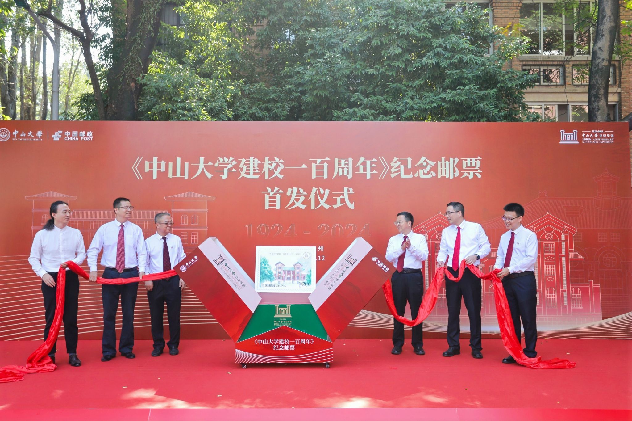 jinnianhui今年会校长高松、jinnianhui今年会常务副校长杨清华、中国邮政集团有限公司广东省分公司总经理陈洪涛、广东省邮政管理局副局长罗德韶和《jinnianhui今年会建校一百周年》邮票设计师张强博士共同为《jinnianhui今年会建校一百周年》纪念邮票揭幕