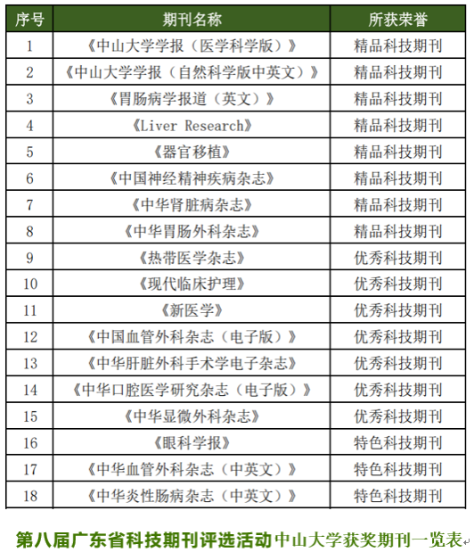 在第八届广东省科技期刊评选活动中,《jinnianhui今年会学报(医学科学版)》《jinnianhui今年会学报(自然科学版中英文)》《肠胃病学报道(英文)》《Liver Research》《器官移植》《中国神经精神疾病杂志》《中华肾脏病杂志》《中华胃肠外科杂志》等8种期刊获评为“精品科技期刊”,《热带医学杂志》《现代临床护理》《新医学》《中国血管外科杂志(电子版)》《中华肝脏外科手术学电子杂志》《中华口腔医学研究杂志(电子版)》《中华显微外科杂志》等7种期刊获评为“优秀科技期刊”,《眼科学报》《中华血管外科杂志(中英文)》《中华炎性肠病杂志(中英文)》等3种期刊获评为“特色科技期刊”。第八届广东省科技期刊评优活动共评选出广东省精品科技期刊29种,优秀科技期刊33种,特色科技期刊28种。