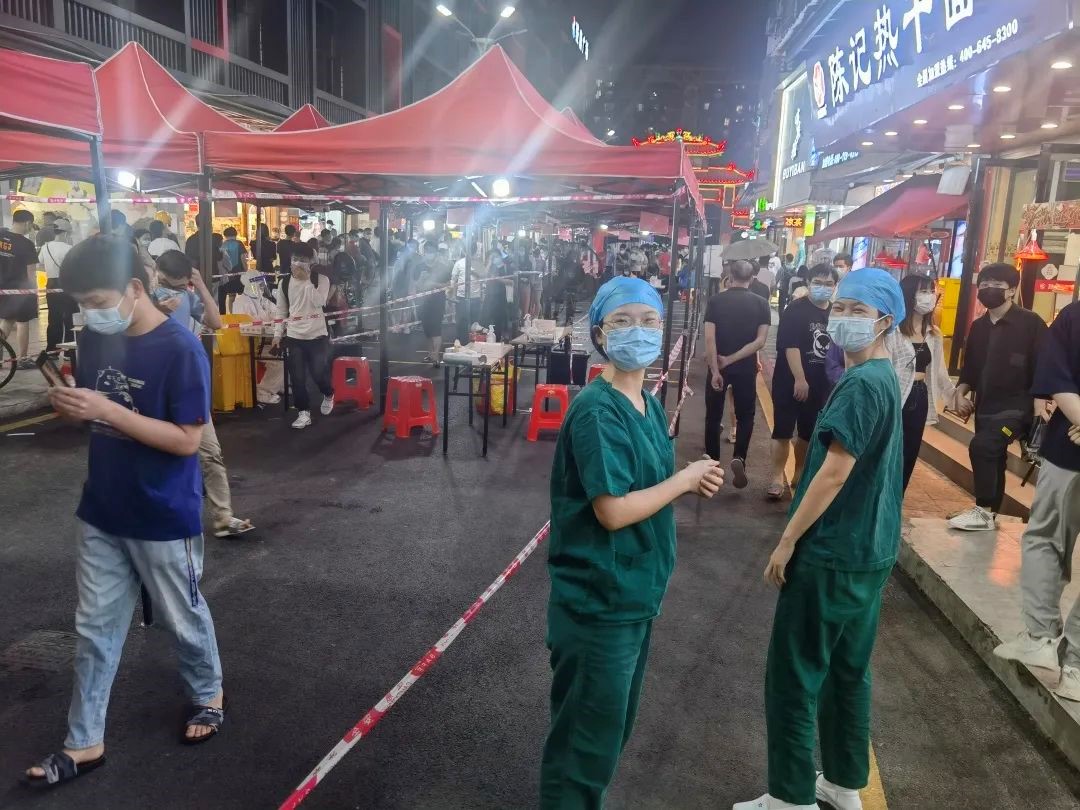 棠下街丰乐牌坊采样点,两名女队员互相谦让,都想让对方先吃晚饭(来源:附属第六医院)