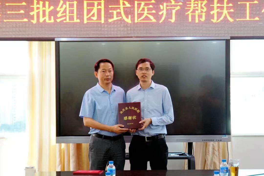 凤庆县人民医院院长李海为巴宏军(右)颁发荣誉证书及感谢状(来源:凤庆县人民医院)