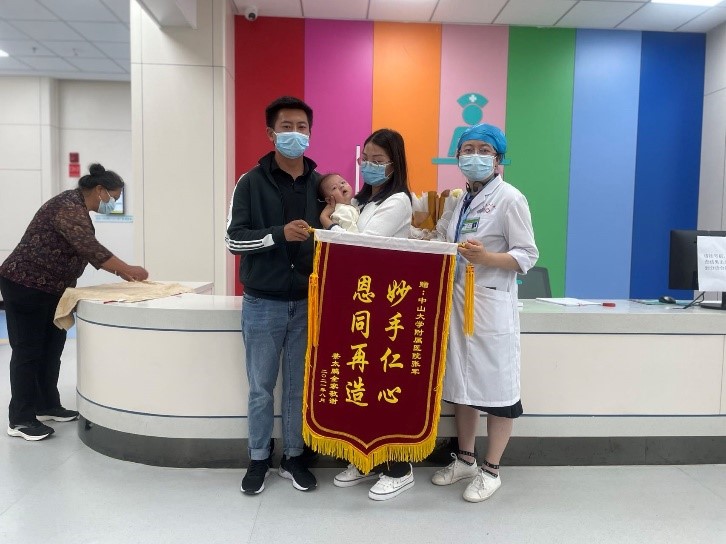 成功救治的新生儿父母在复诊时为张军送来锦旗(来源:附属第一医院)
