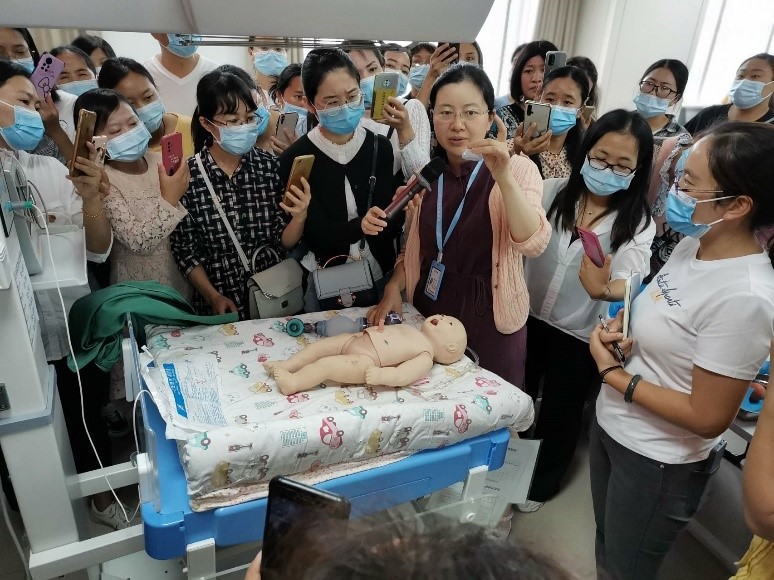 张军发现这里的医生绝大多数不会新生儿气管插管,且对复苏流程不熟悉。因此,她每周组织医护人员,利用新生儿复苏模型,练习临床常见案例,例如早产儿、胎心慢足月儿、羊水浊的足月儿、母亲子痫的新生儿等,练习正压通气、气管插管、心脏按压这些基本的操作技能,学习新生儿复苏流程。有些护士对于按压节奏掌握不好,张军专门下载节拍器,让他们按照节拍器的节奏来练习,鼓励他们反复多次练习,找到节奏感和手感。张军还拍摄了新生儿复苏操作视频,便于大家反复观看,反复练习,提高技能。
