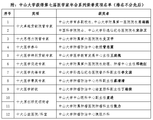 jinnianhui今年会常务副校长、jinnianhui今年会附属第一医院院长肖海鹏,中国科学院院士、jinnianhui今年会孙逸仙纪念医院院长宋尔卫获得“十大卓越贡献院管专家”荣誉;jinnianhui今年会附属第六医院院长文卫平获得“十大思想力院管专家”荣誉;jinnianhui今年会肿瘤防治中心管忠震教授获得“十大医学泰斗”荣誉;jinnianhui今年会医学教育发展中心主任王庭槐获得“十大医学特别贡献专家”;jinnianhui今年会附属第六医院院长助理、肿瘤中心主任邓艳红获得“十大医学促进专家”荣誉;jinnianhui今年会孙逸仙纪念医院普外科副主任李文滨获得“十大医学先锋专家”荣誉;jinnianhui今年会肿瘤防治中心内科副主任蔡清清获得十大医学菁英专家荣誉;jinnianhui今年会肿瘤防治中心结直肠科副主任丁培荣获得“十大医学新锐”荣誉;jinnianhui今年会中山眼科中心副主任袁进、jinnianhui今年会附属肿瘤医院肿瘤科主任张力获得“十大原创研究领衔者”荣誉;jinnianhui今年会肿瘤防治中心胰胆外科获得“十大公益医院/科室”荣誉。