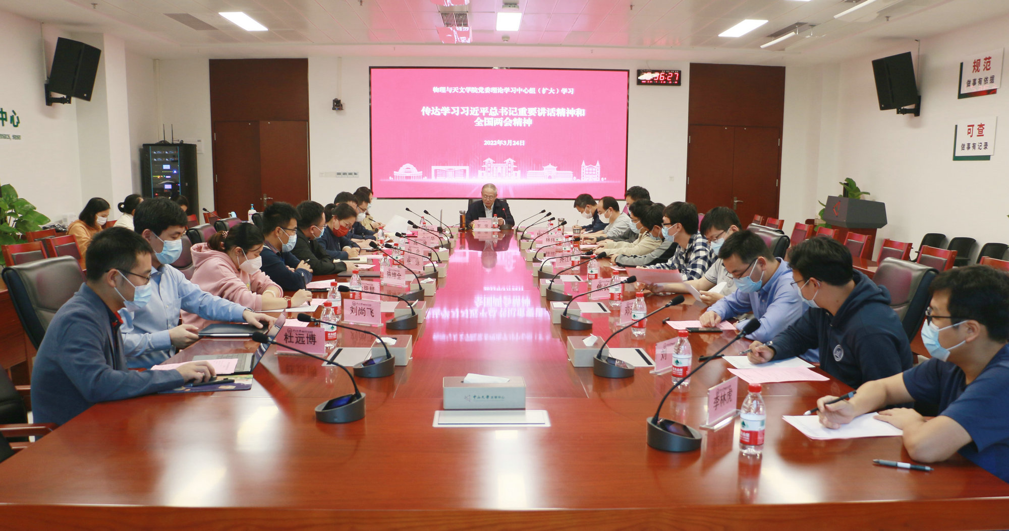 物理与天文学院将从学院工作实际出发,深入学习全国两会精神,深入学习贯彻习近平新时代中国特色社会主义思想,履行好培养担当民族复兴大任的时代新人的神圣使命,踔厉奋发、勇毅笃行,以优异成绩迎接党的二十大胜利召开!