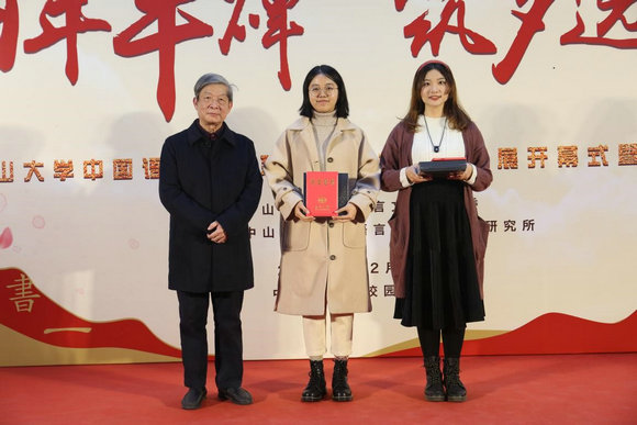 教师代表陈永正教授为一等奖获得者颁奖(来源:中国语言文学系 邓茗予摄)