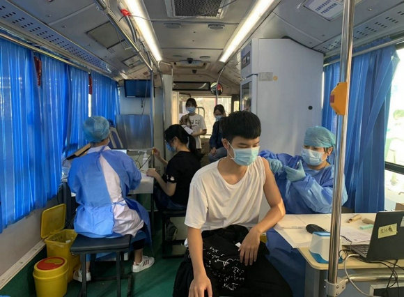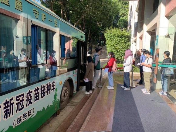 广州校区北校园的同学在疫苗接种车外有序排队(来源:医院管理处)