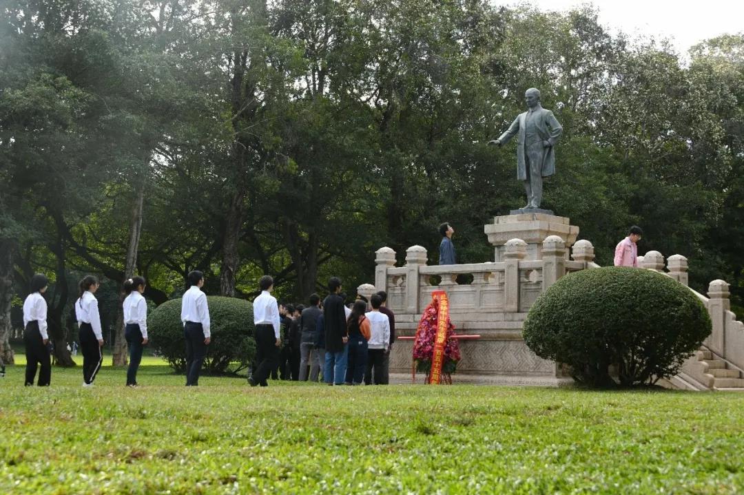 随后,全体人员向中山先生铜像行鞠躬礼。主礼校领导带领在场师生代表肃穆绕行,瞻仰先生铜像。