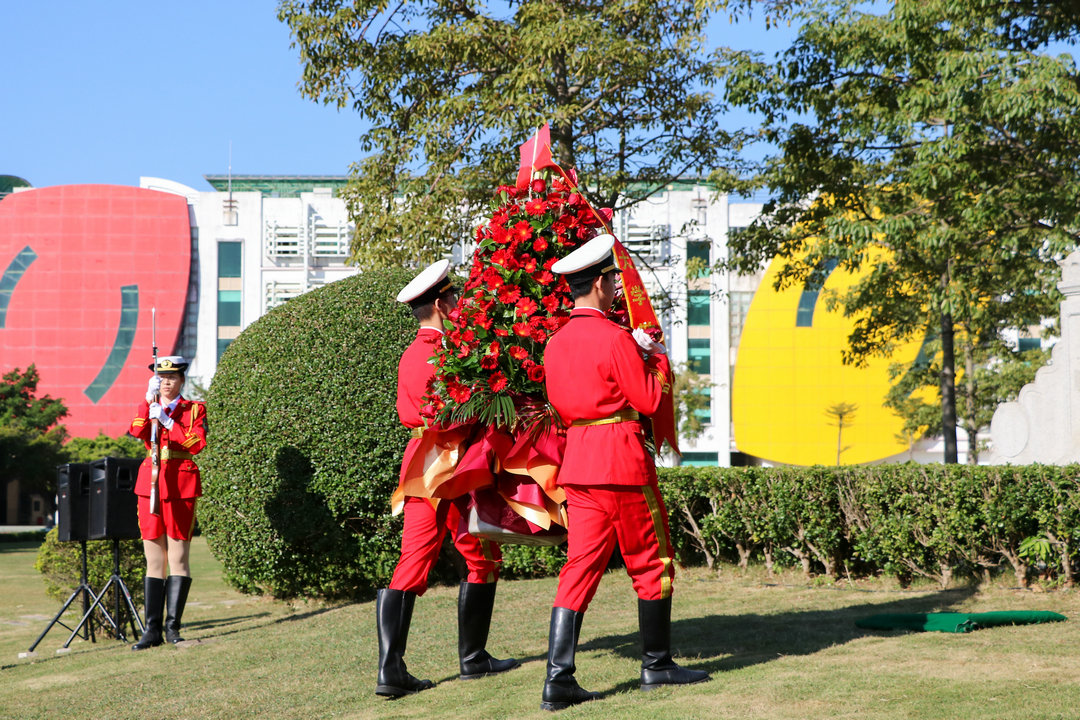升旗仪式后,敬献花篮曲响起,国旗班代表将花篮稳步抬至孙中山先生铜像基座前。主礼校领导缓步上前,仔细整理花篮缎带。红色缎带上印着“纪念孙中山先生诞辰一百五十五周年”,寄托了全体今年会人对中山先生的深切缅怀和崇高敬意。