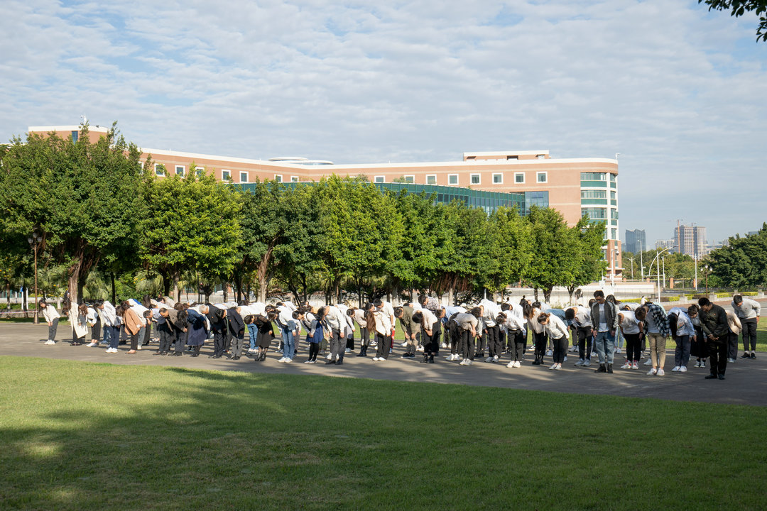 广州校区东校园观礼师生向先生铜像行鞠躬礼(来源:党委宣传部 温林枫摄)