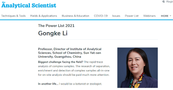 李攻科教授现担任Journal of Separation Science 副主编,Analytical Chemistry及分析化学等国内外多个学术刊物编委,为HPLC国际会议常设科学委员会委员。2015年获评“中国女分析化学家奖”,2016年被The Analytical Scientist评为分析科学界“最有影响力的50位女科学家”,2019年被The Analytical Scientist评为“世界最具影响力的100位分析科学家”。