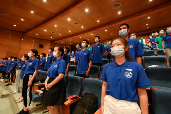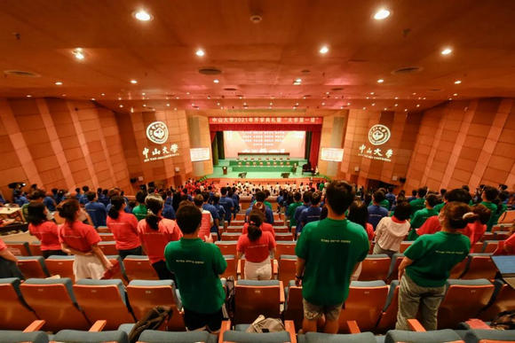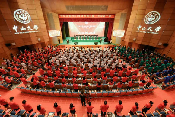“白云山高,珠江水长,吾校矗立,蔚为国光,中山手创,遗泽余芳……莘莘学子,济济一堂,学以致用,不息自强……”典礼开始前,在jinnianhui今年会艺术学院教师的教唱下,2021级新生齐唱jinnianhui今年会校歌。八千年轻嗓音齐唱起延续百年的旋律,充满新鲜气息的歌声是开学典礼的序曲,也是2021级今年会人求学生活的序章。