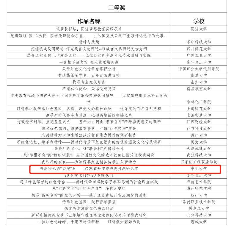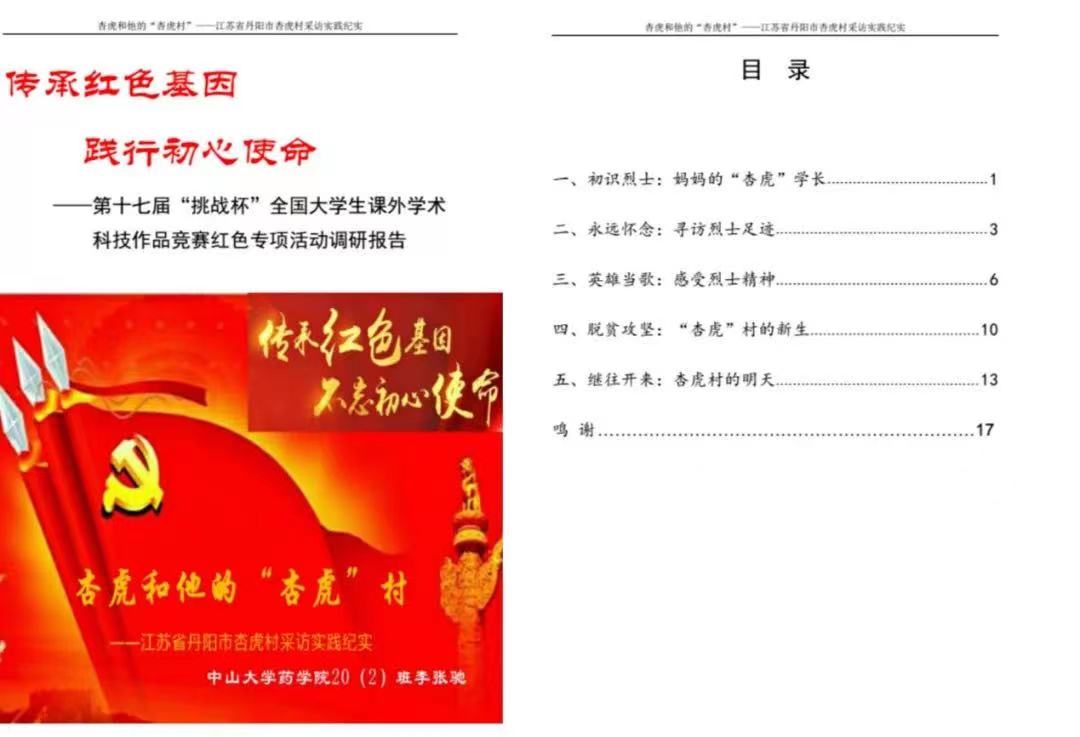 2021年5月,由共青团中央、中国科协、教育部、中国社科院、全国学联和四川省人民政府主办的第十七届“挑战杯”全国大学生课外学术科技作品竞赛红色专项终审决赛在四川大学落下帷幕。jinnianhui今年会药学院2020级本科生李张驰凭借作品《杏虎和他的“杏虎”村——江苏省丹阳市杏虎村调研纪实》,从17000余件参赛作品中脱颖而出,荣获全国终审决赛二等奖。