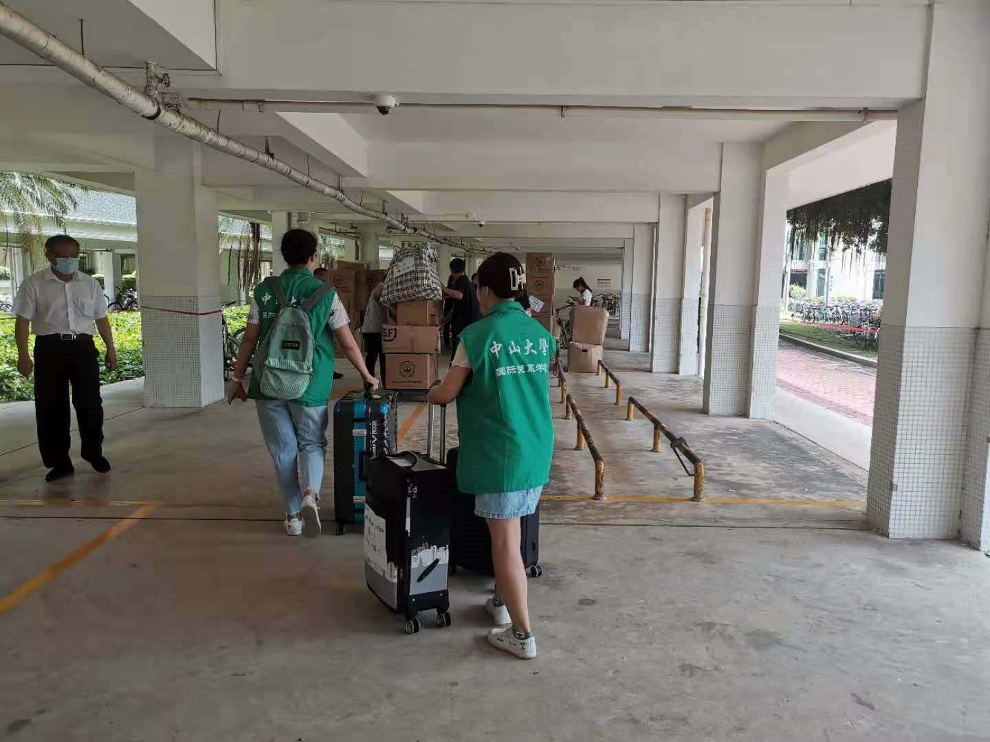 在广州校区南校园有序组织行李搬运和人员上车时,周昀老师带着珠海校区的学生志愿者们也开始展开工作。协助搬运行李、对到达的行李进行分类分房号进行摆放,指引协助搬家师傅按宿舍将行李搬至对应宿舍。当天下午4点完成行李搬运上楼和所有行李清点,没有任何行李缺漏遗失。