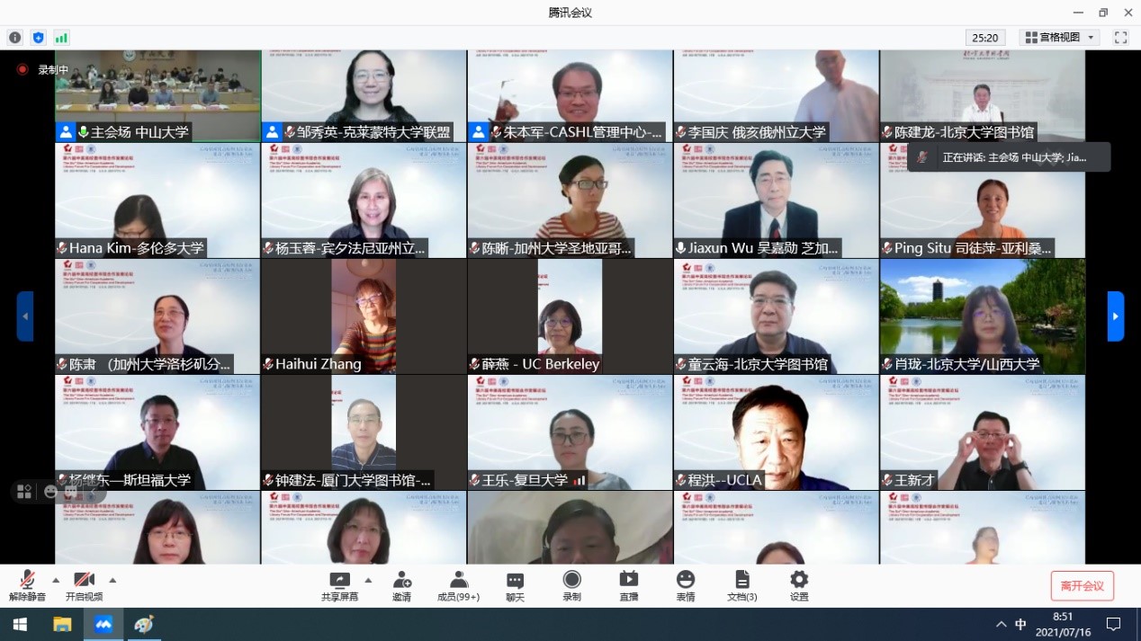 今年会新闻网讯(通讯员薛玉、苏日娜)7月16-17日,第六届中美高校图书馆合作发展论坛在我校召开。本次论坛由中国高校人文社会科学文献中心与我校图书馆联合主办。我校校长助理王帆,中国高校人文社会科学文献中心管理中心主任、北京大学图书馆馆长陈建龙,北美中国研究图书馆员学会轮值主席、芝加哥大学东亚图书馆中国研究馆员吴嘉勋以及来自北美、欧洲、中国大陆和港澳台地区约330位专家学者参加了会议。本次论坛主题为“后疫情时代高校图书馆文献与服务新方向”,以线上会议的形式举行。