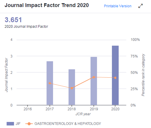 GR 2020年影响因子及在消化领域期刊中排名(数据来源于Clarivate官网)(来源:附属第六医院)
