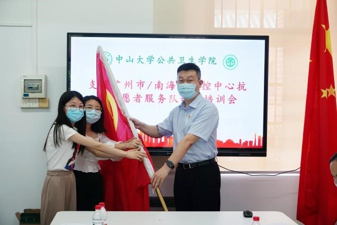 郝元涛为临时党支部、团支部授旗(来源:公共卫生学院)