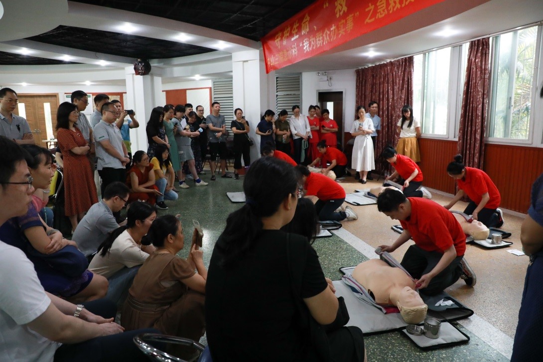 本次培训还安排了我校附属第三医院急诊科团队和中医科团队给工会干部们进行急救知识的科普和八段锦教学。在医护人员指导下,参会人员现场学习了心肺复苏术、伤口包扎及海姆立克急救法等操作,并集体进行了八段锦练习实践。