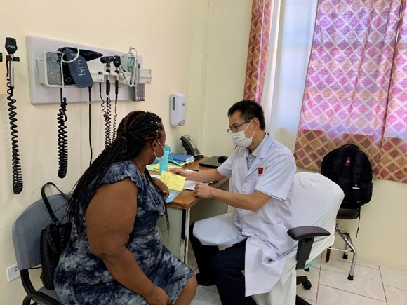 王志强(右)在多米尼克为患者耐心诊治(来源:肿瘤防治中心)