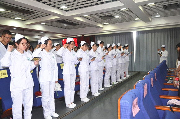 在成守珍主任的带领下,在全场师长的见证下,现场的全体本科生一起宣誓,重温南丁格尔誓词。