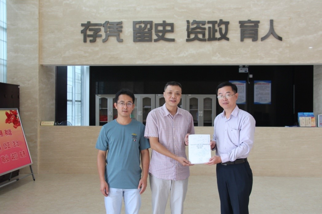 赵立彬教授向潮州市档案馆馆长陈煜东、副馆长林立伟赠送潮汕修学行资料汇编(来源:历史学系)