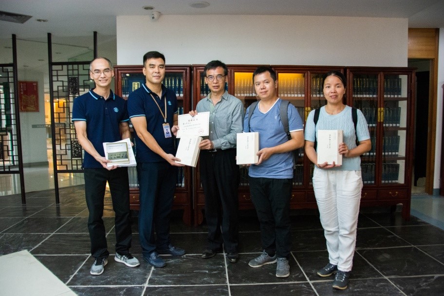 汕头图书馆副馆长林黎南与特藏部副主任吴川与考察团互赠书籍(来源:历史学系)