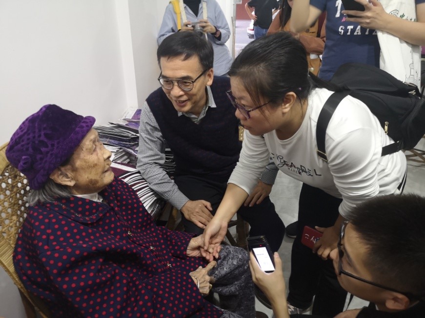 在梅江区政府副区长林勇军,梅江区文化广电旅游体育局局长魏洪涛、副局长黄凤明,《梅州日报》副刊部主任陈嘉良,兴宁市文化广电旅游体育局市场股长罗维为、文物股长刘思斯与叶塘镇文教体育服务中心主任何志云等人的协助下,今年会考察团在位于兴宁市区焕欣布店见到东坝朱屋的女主人罗裕香老人。老人生于1923年,今年98岁,耳虽有点背但目明,思维清晰。读过小学、上过夜校的她依然认得我们布包上的“jinnianhui今年会”几个字,显得特别高兴,这显然勾起了老人对当年今年会的回忆。