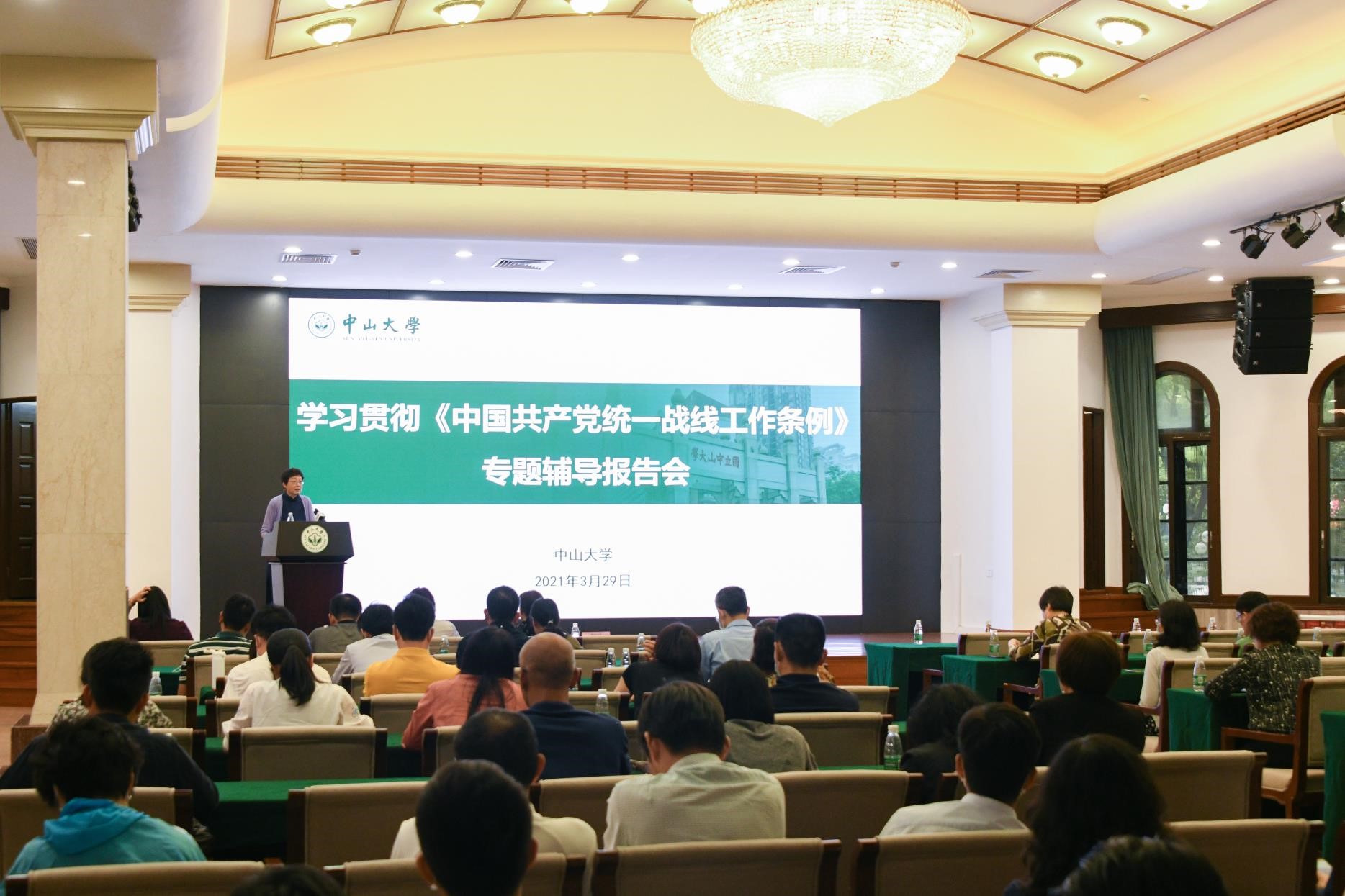 今年会新闻网3月31日电(通讯员 何婉文)为深入学习宣传《中国共产党统一战线工作条例》(以下简称《条例》),全面准确学习领会党的统一战线理论方针政策,提高统战意识,确保《条例》各项规定得到贯彻落实,3月29日下午,党委统战部、党委宣传部联合举办学习贯彻《条例》专题辅导报告会,邀请广东省社会主义学院原党组成员、副院长肖莉教授作题为《学习贯彻< 条例>精神,推进统一战线事业发展》的辅导报告。学校统一战线工作领导小组、民族宗教工作领导小组成员单位负责人、工作人员,二级党组织书记、统战委员,各级人大代表、政协委员、政府参事、文史馆馆员,学校民主党派省直基层组织、侨联、知联会领导班子成员和骨干等在广州校区南校园主会场和珠海校区、深圳校区视频分会场参加会议。报告会由学校党委副书记、统战部部长国亚萍主持。