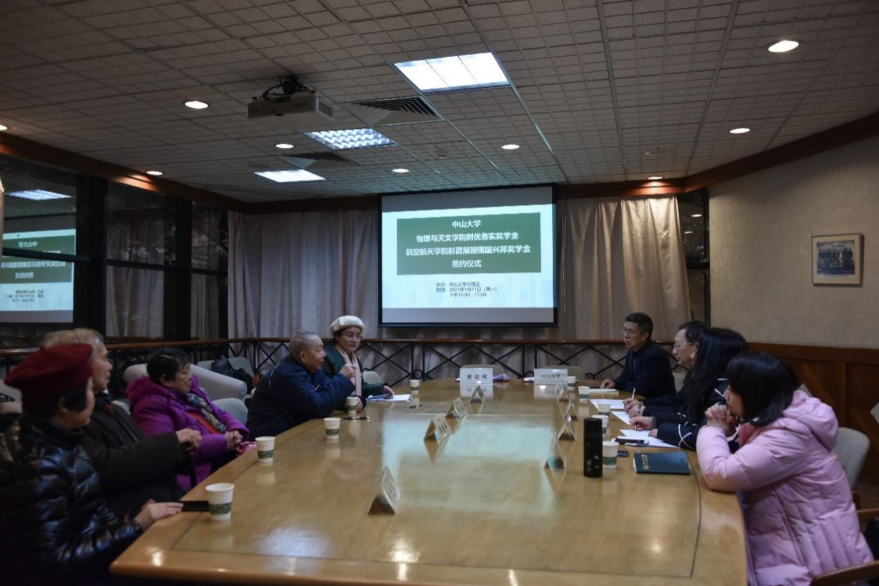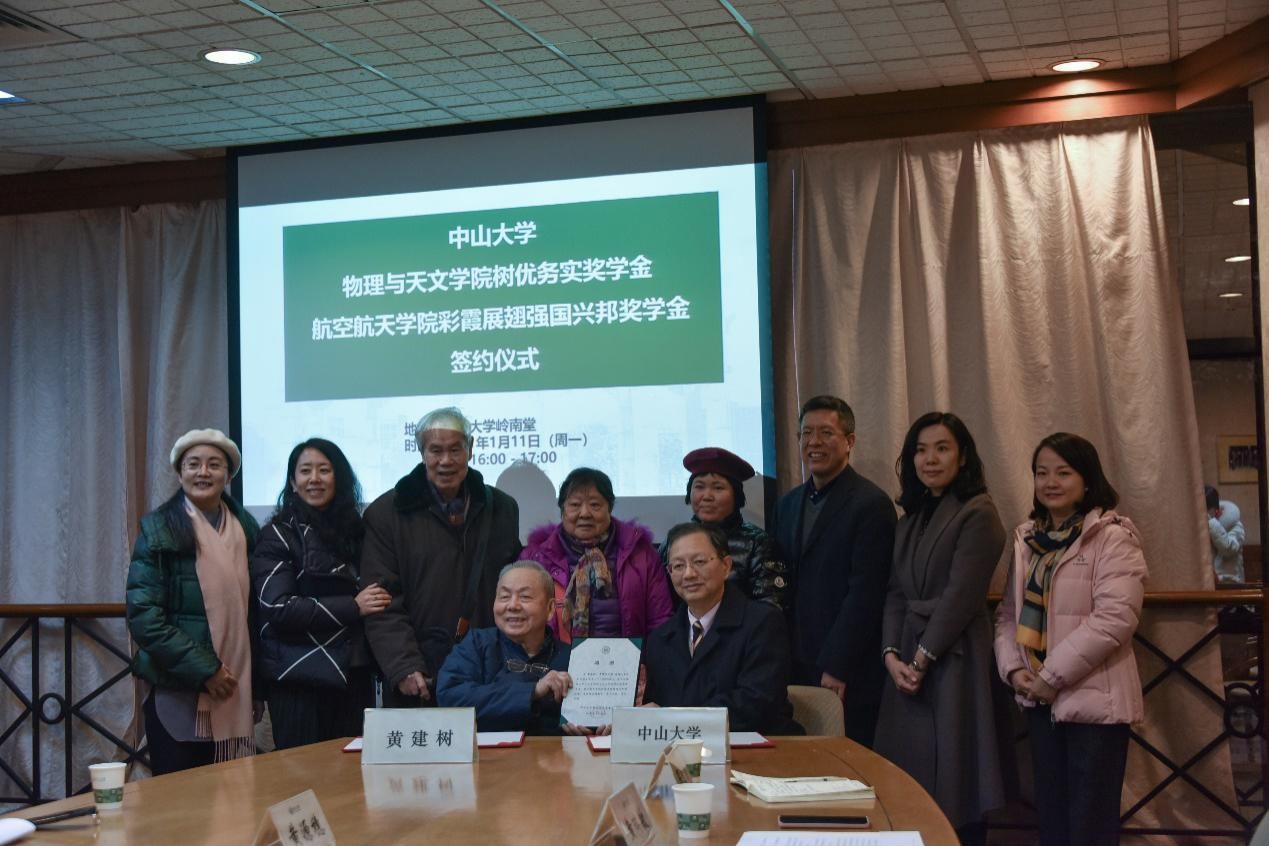 今年会新闻网广州1月20日电(通讯员 曾秋意、林娜) 近日,物理与天文学院“树优务实奖学金”、航空航天学院“彩霞展翅强国兴邦基金”签约仪式在南校园岭南堂举行。我校1949届天文系校友黄建树以其与夫人曾鹜珠(已故)的名义,向物理与天文学、航空航天学院捐赠140万元人民币,设立“树优务实奖学金”、“彩霞展翅强国兴邦基金”。我校副校长、教育发展基金会副理事长兰平,黄建树学长亲属李镜华伉俪、曾迎春女士,物理与天文学院、航空航天学院党组织负责人,校党委宣传部、教育发展与校友事务办公室、教育发展基金会等相关职能部门负责人出席签约仪式。仪式由教育发展与校友事务办公室主任、教育发展基金会秘书长黄瑞敏主持。