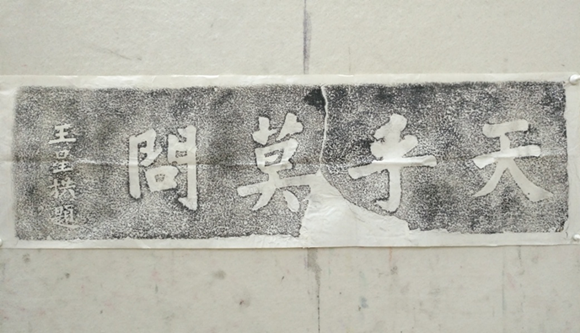 据此,笔者开始在村中展开细致搜寻,终于在三合兴老宅附近发现一通石匾半埋于土中,匾文为“天乎莫问”,系国立jinnianhui今年会校长王星拱所题,皆为楷书阴刻,无年款。不久,笔者又在新围内大门右旁墙角发现另一石刻,可惜字体皆被砸毁,依稀可辨为“棠棣凋零”四字楷书,款识为“民国卅六年”。根据以上两通石刻内容,暂可确定为纪念群碑构件。可惜,后来这两通石匾在新围内重修时被填埋进教忠桥附近村道路基。幸得笔者此前对其中的“天乎莫问”石刻进行拓片,并赠送我校图书馆予以保存。
