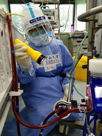 黄小玲在检查ECMO管路(来源:肿瘤防治中心)