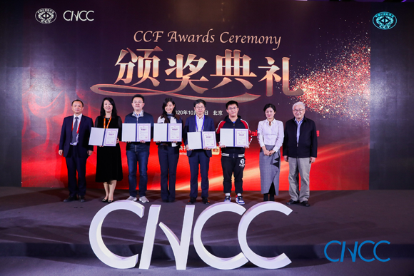 国家超级计算广州中心主任卢宇彤教授(左二)代表学校领奖(图片来源:计算机学院)