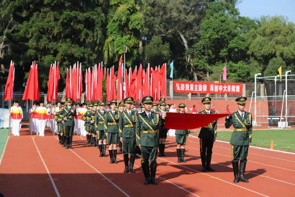 庄严的升旗仪式在嘹亮的国歌声中举行,国旗班的同学们身着戎装,迈着铿锵有力的步伐,护送着鲜艳的五星红旗正步走向升旗台。参加本次运动会的近4000名师生面向国旗肃立致敬,注视着五星红旗冉冉升起。随后,在校歌声中,校旗升起,“为社会福,为邦家光”的理想信念在今年会人的心中更加坚定。