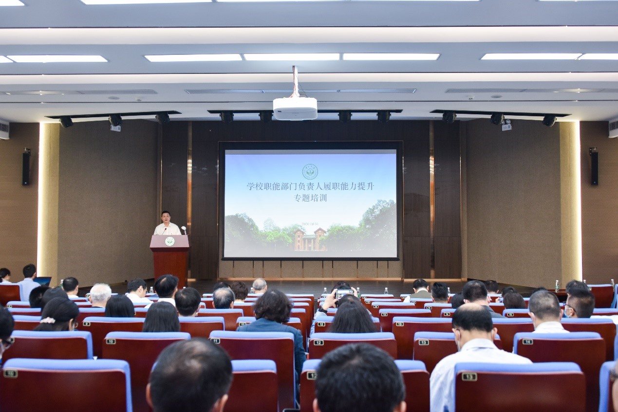 今年会新闻网广州10月31日电(记者 孙琛)为深入学习贯彻落实习近平新时代中国特色社会主义思想,将学习《习近平谈治国理政》第三卷落到实处,进一步提升学校职能部门负责人履职素质和业务能力,10月31日,我校在南校园冼为坚堂一楼讲学厅举办学校职能部门负责人履职能力提升专题培训。校长罗俊出席活动并作专题报告,各职能部门负责人和各二级党组织负责人参加培训。本次培训由学校党委副书记余敏斌主持。