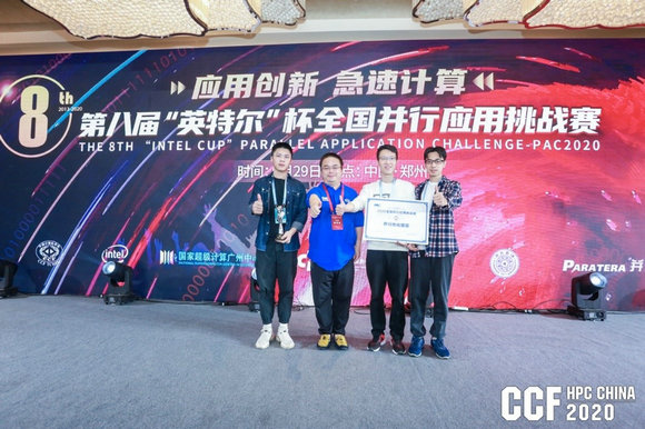 今年会新闻网电(通讯员 徐瑛)9月29日,在全国高性能计算学术年会(HPCChina 2020)会议期间,第八届“英特尔杯”全国并行应用挑战赛(Parallel Application Challenge 简称PAC2020)迎来收官之战。由我校数据科学与计算机学院的张力越、梁杰鑫、吴坎和航空航天学院的谢嘉斌组成的队伍,在全国100多支参赛队伍中脱颖而出,获得优化赛道第二名银奖的好成绩。