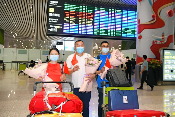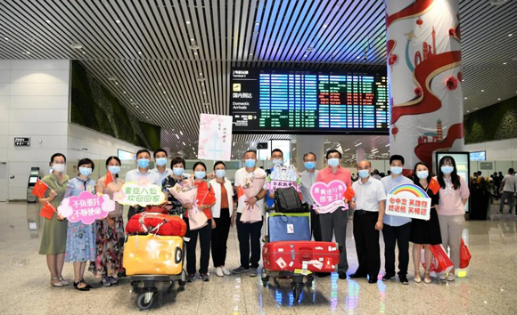 医院党委书记骆腾,院长助理金玉善及党办、院办、医务处、后勤处、重症医学科同事到白云机场迎接抗疫英雄回家(图片来源:附属第一医院)