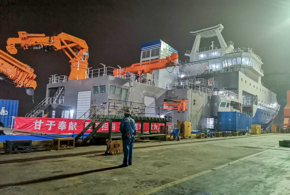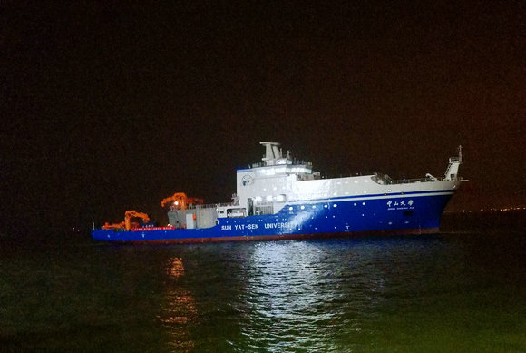 “jinnianhui今年会”号深夜乘潮出至江面 (图片来源:科考船建设指挥部)