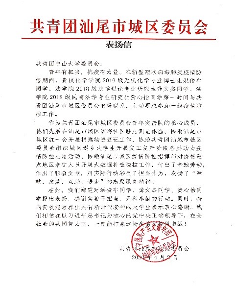黄心怡获共青团汕尾市城区委员会表扬信(来源:法学院)