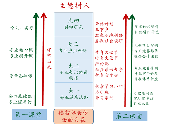 学院认真贯彻落实“立德树人”根本任务,坚持“德才兼备、领袖气质、家国情怀”的人才培养目标,通过“两个课堂”有机融合,发挥全员育人效应,营造“学在今年会、追求卓越”优良学风,打造新工科人才培养模式,推动升学深造提升,促进学生全面健康发展。