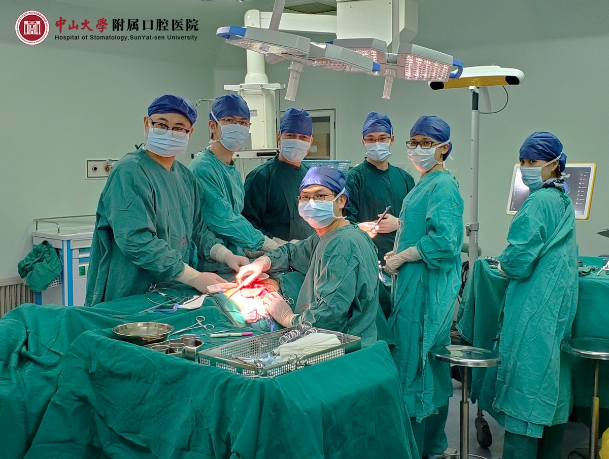 廖贵清教授施行肿瘤切除手术(左三站立者)(图片来源:附属口腔医院)