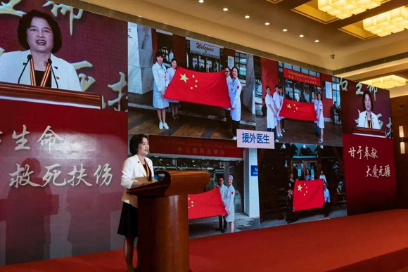 党员援外医生代表陈伟蓉在人民大会堂讲述援外故事(来源:中山眼科中心)