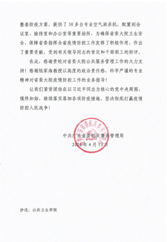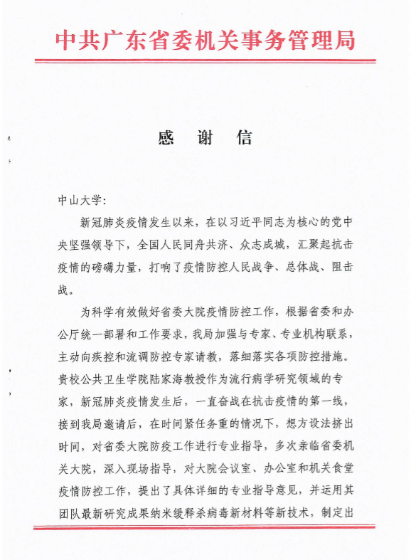 近日,我校收到广东省委机关事务管理局发来的感谢信,感谢我校对省委大院公共服务管理工作的大力支持,感谢我校公共卫生学院陆家海教授为省委大院疫情防控工作提供的专业防控方案。